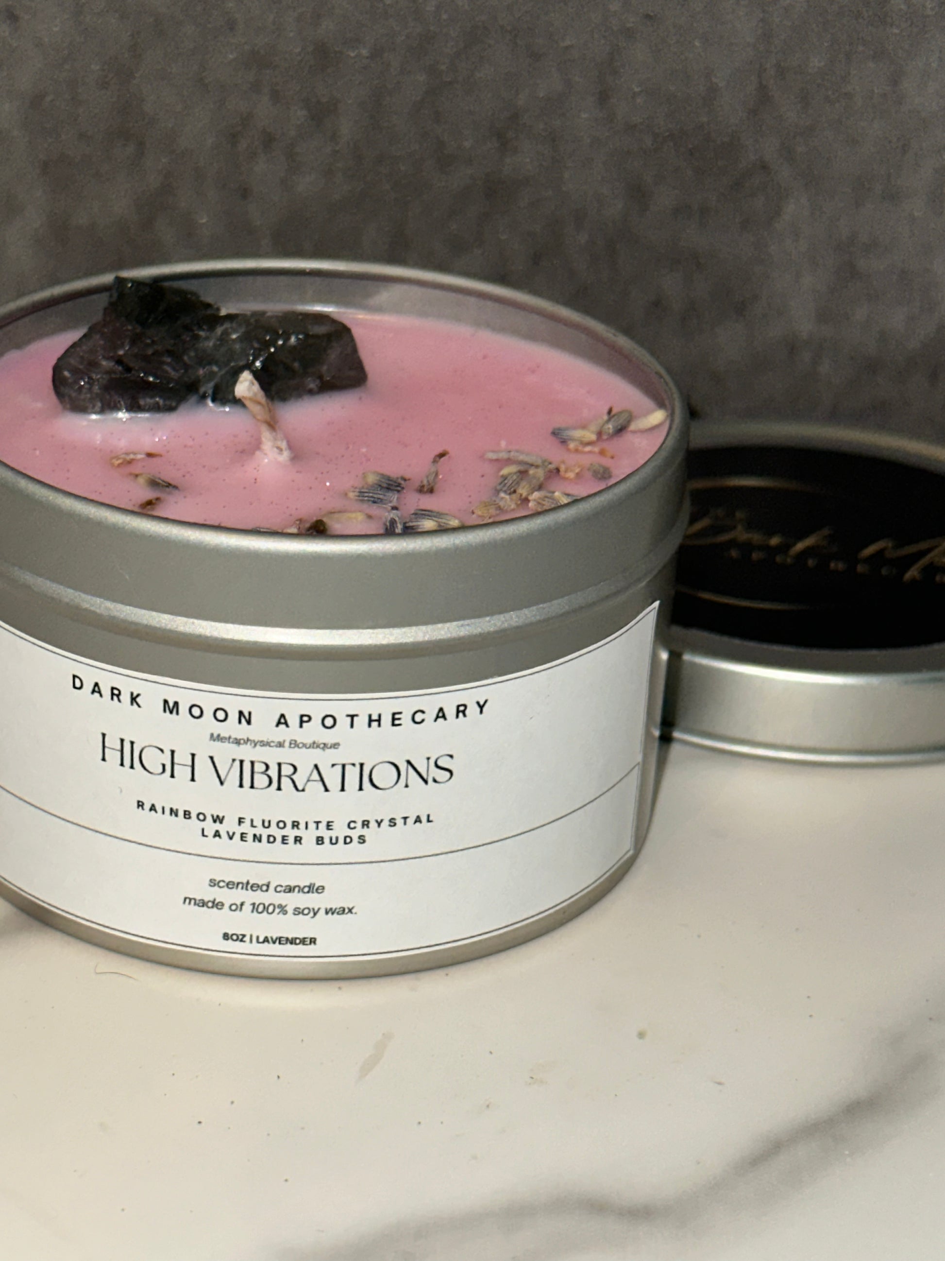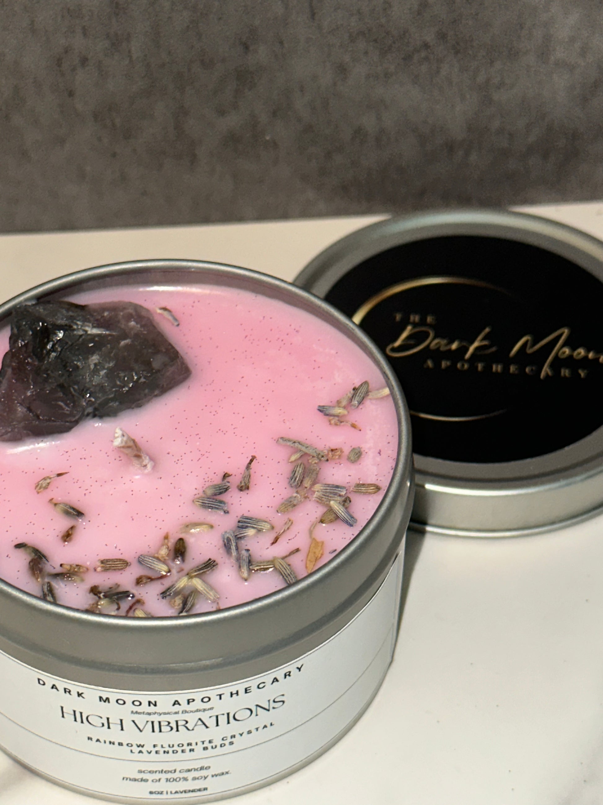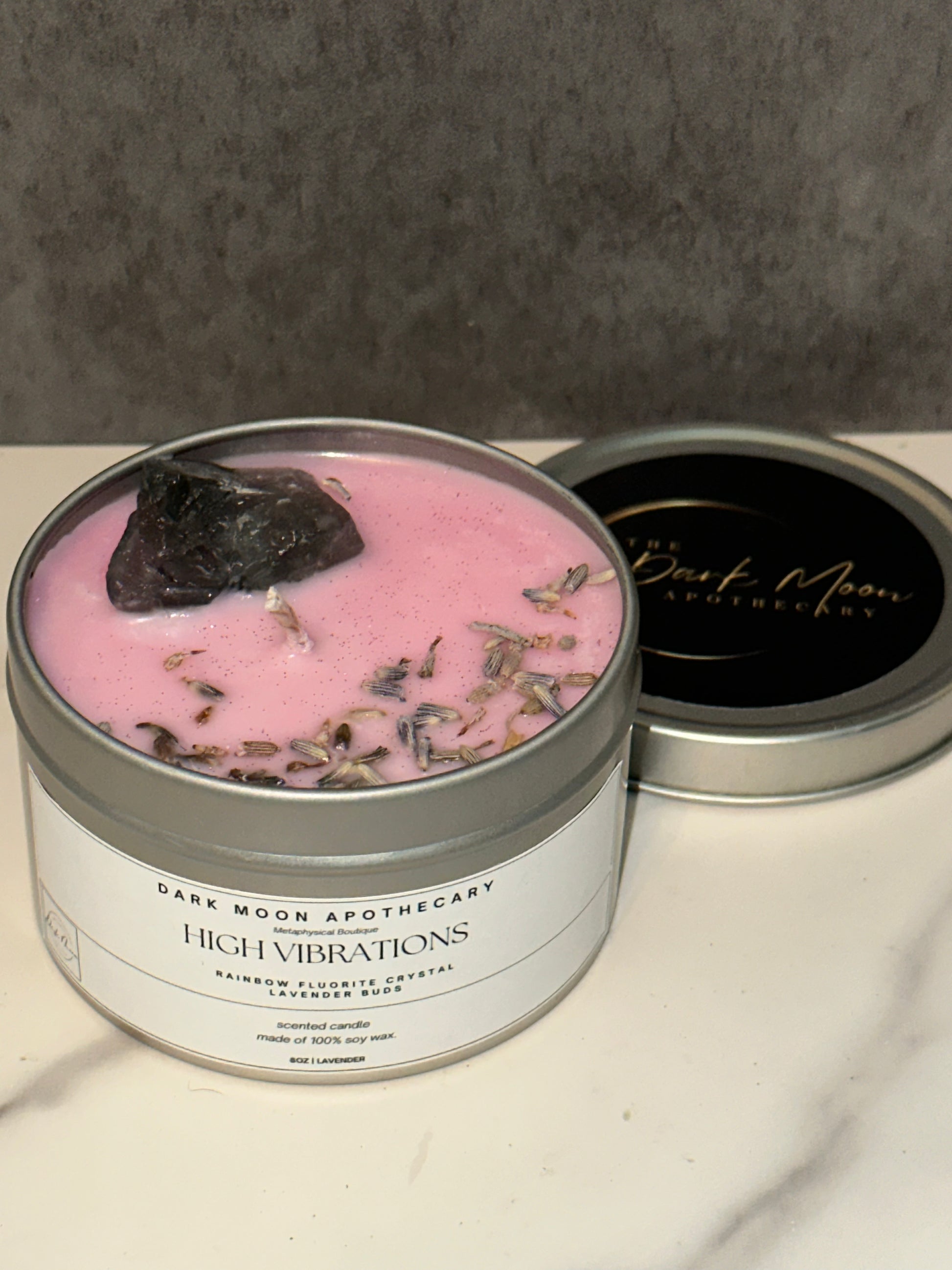 Radiate light and lift your spirit with High Vibrations, an energy-boosting blend designed to elevate your mood and clear your space. Hand-poured with 100% soy wax in a stunning pink hue, this 8oz candle features a rainbow fluorite crystal, known for its ability to harmonize the mind, amplify focus, and realign energy fields. Scattered lavender buds add a calming finish, balancing the vibrant aura with grounding tranquility.