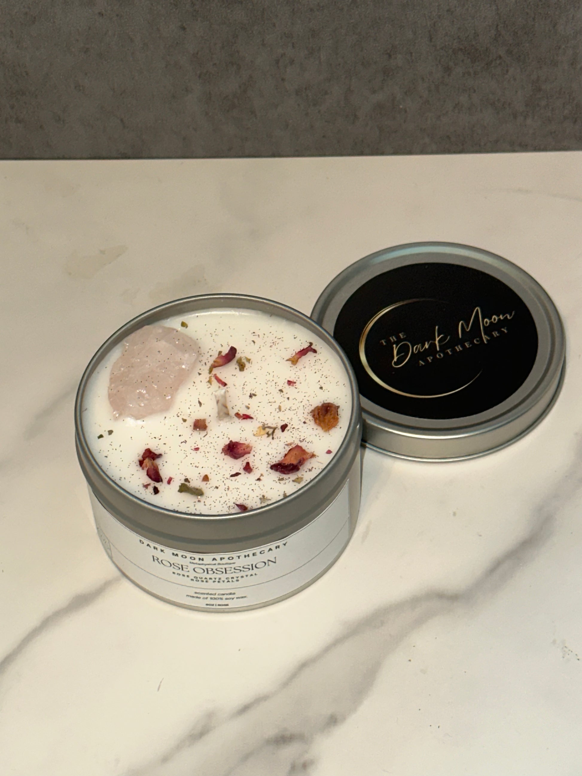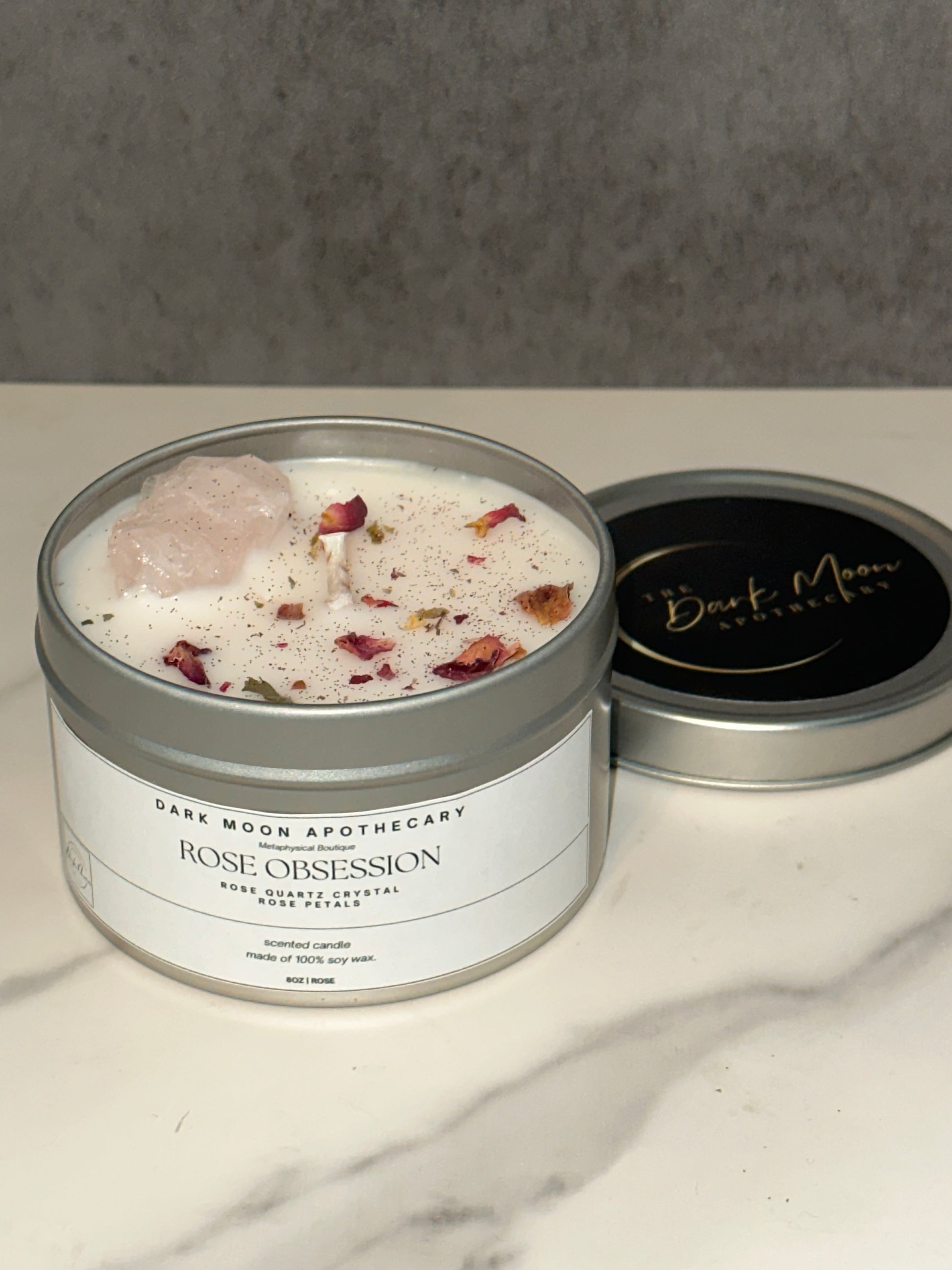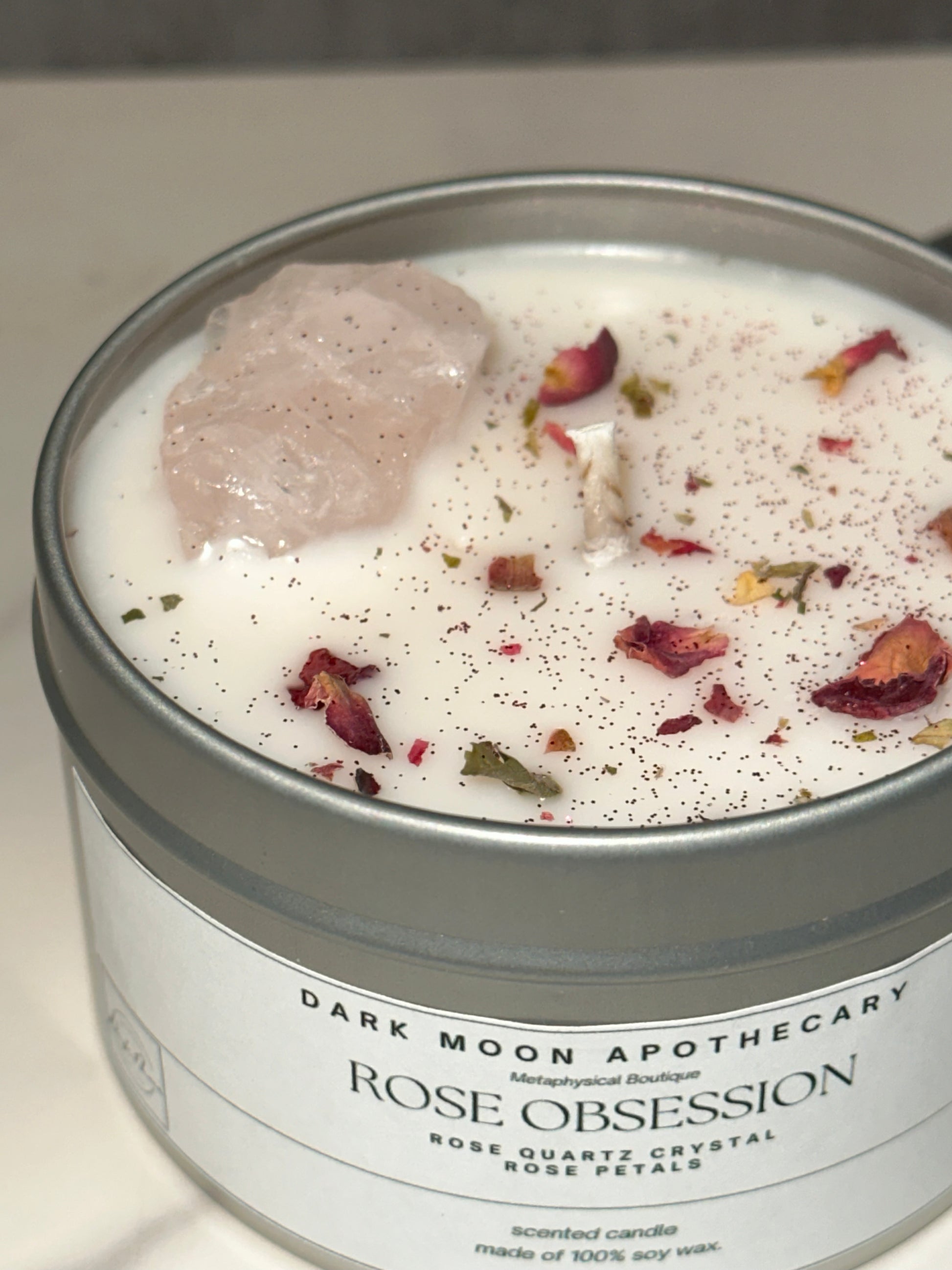 Lush, romantic, and unapologetically indulgent—Rose Obsession is a candle that celebrates love in its most passionate form. Topped with a stunning rose quartz crystal and scattered rose petals, this hand-poured 8oz soy candle radiates softness and sensual energy.