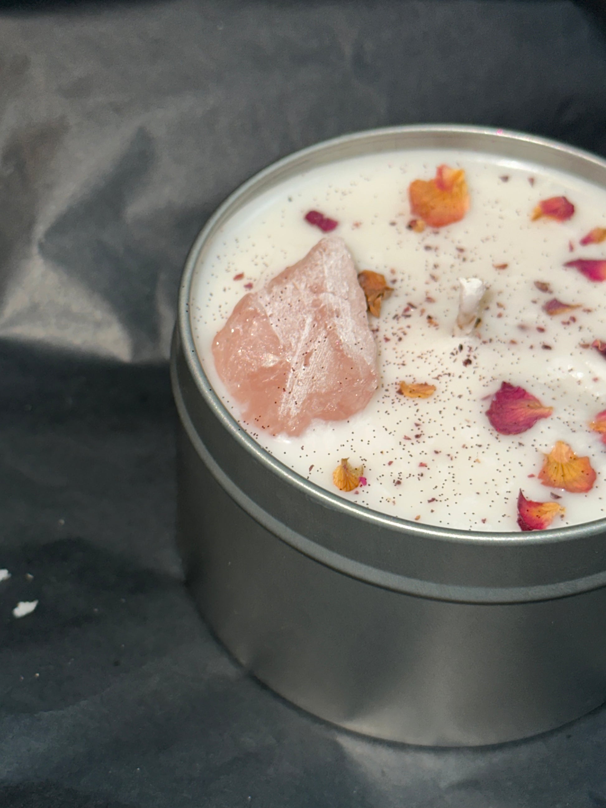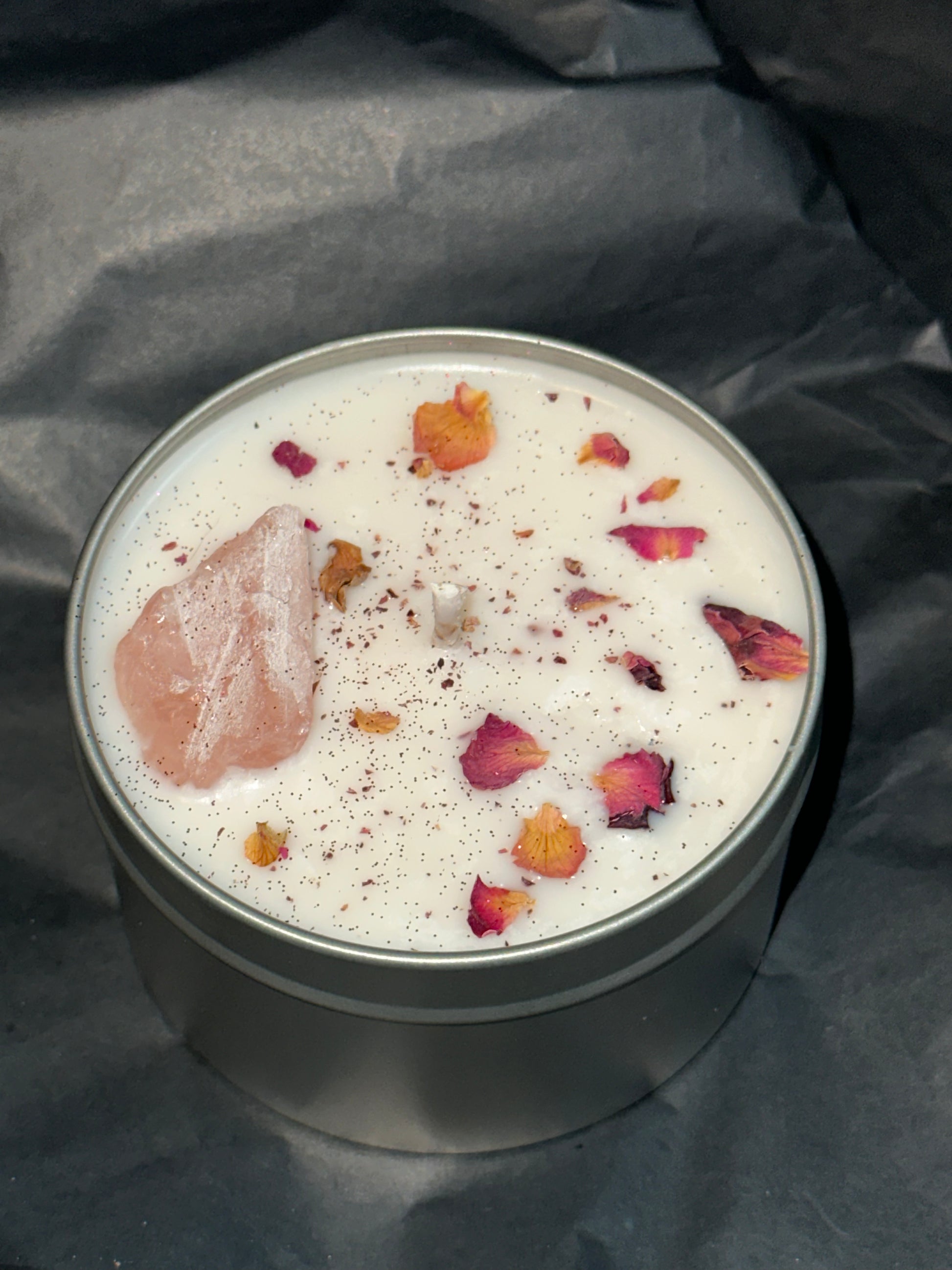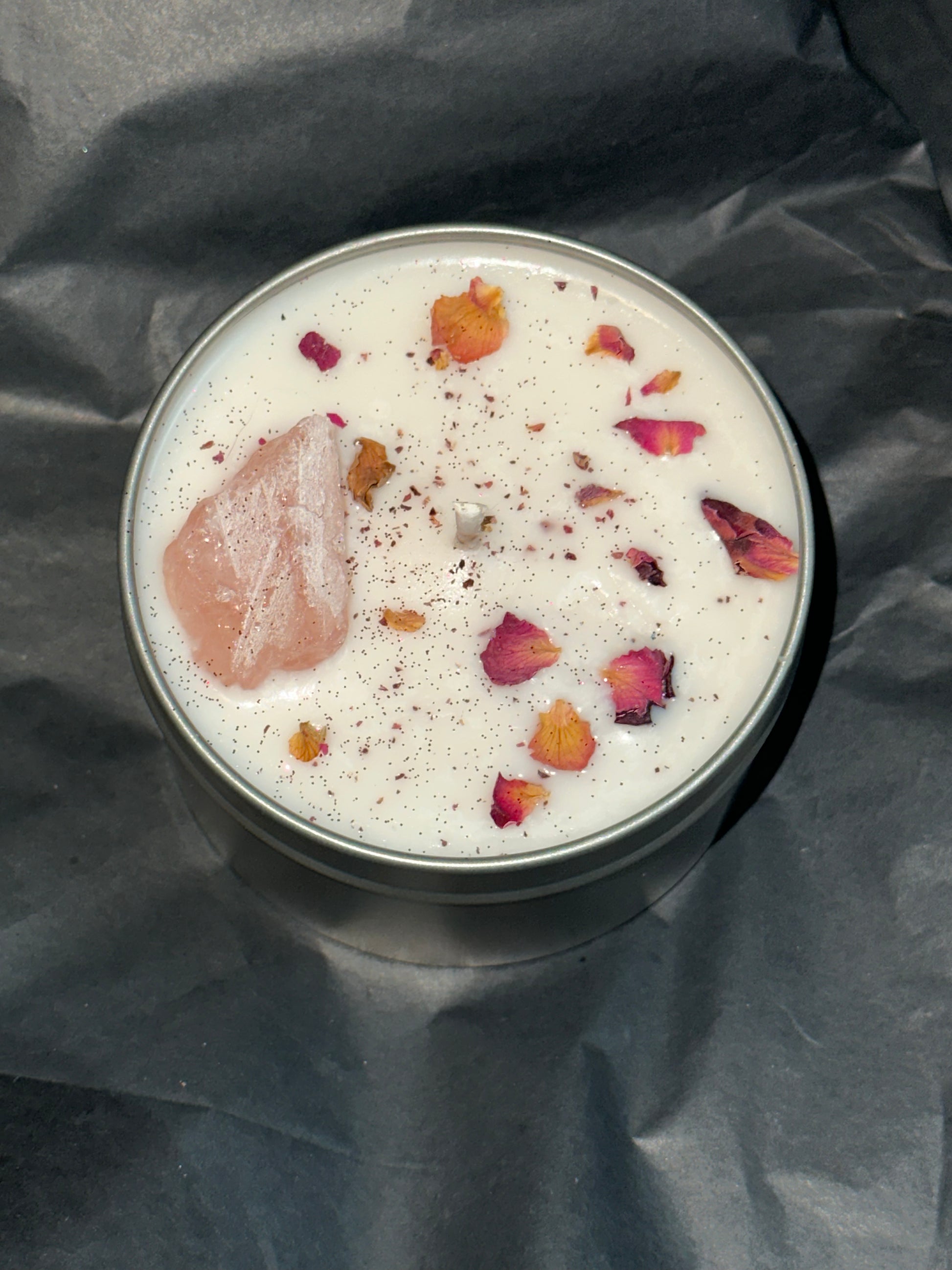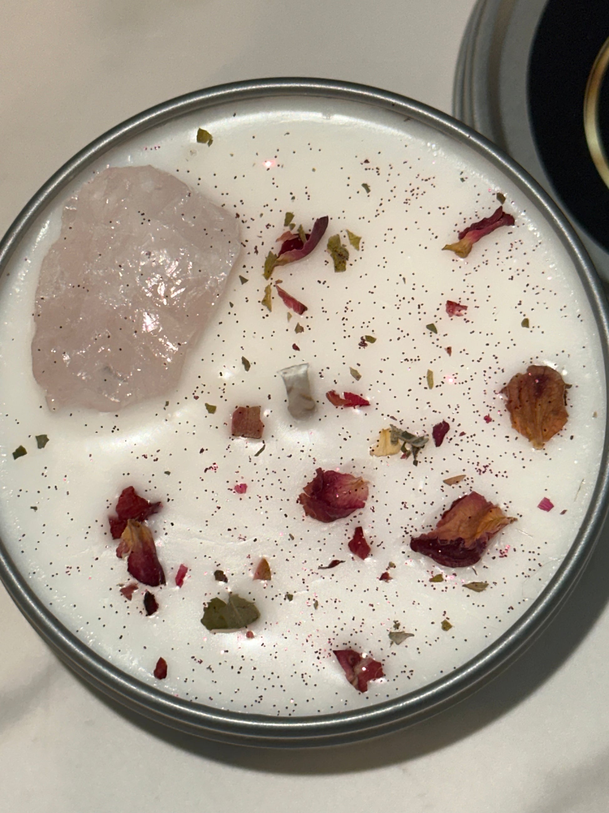 Lush, romantic, and unapologetically indulgent—Rose Obsession is a candle that celebrates love in its most passionate form. Topped with a stunning rose quartz crystal and scattered rose petals, this hand-poured 8oz soy candle radiates softness and sensual energy.