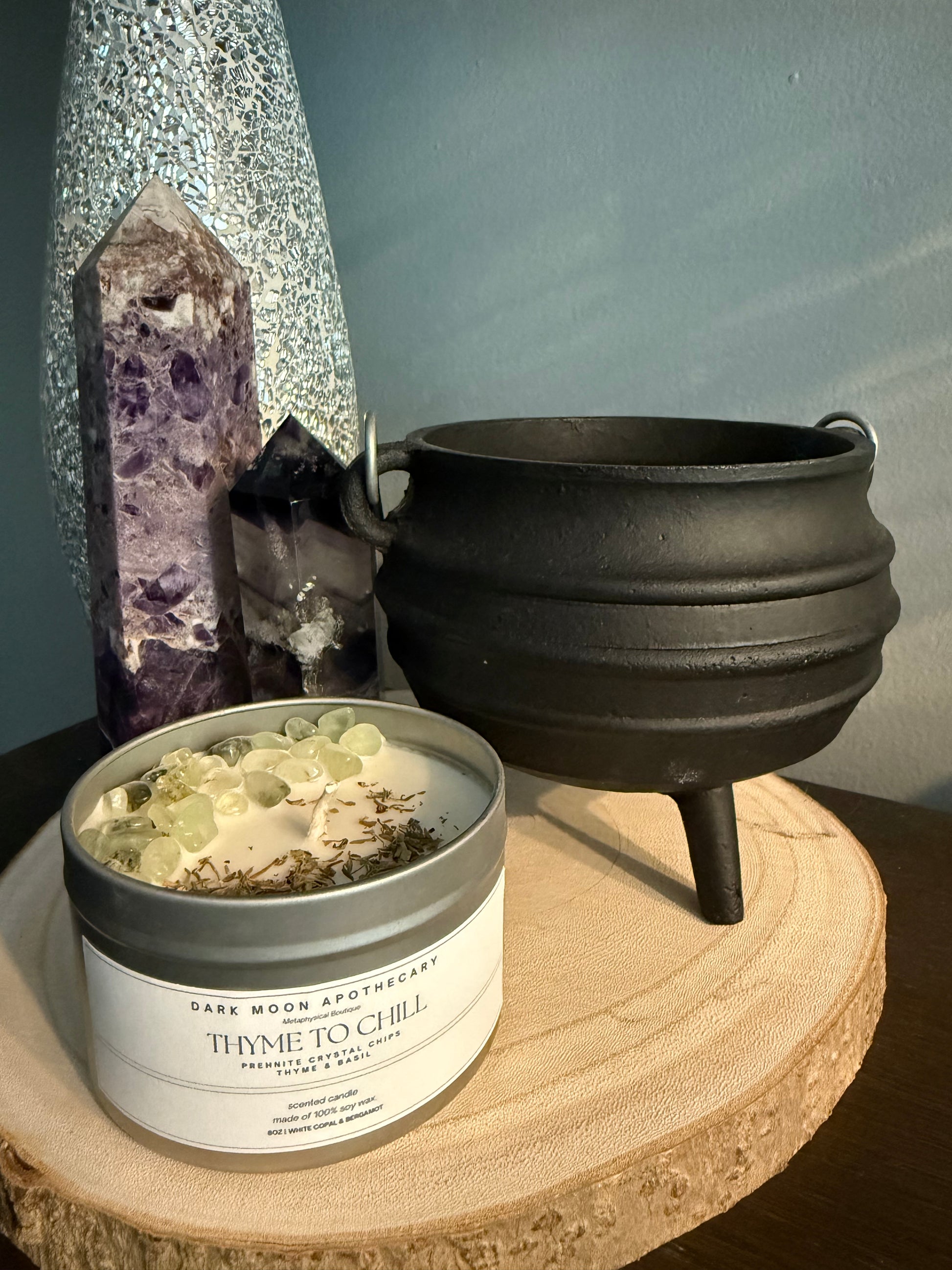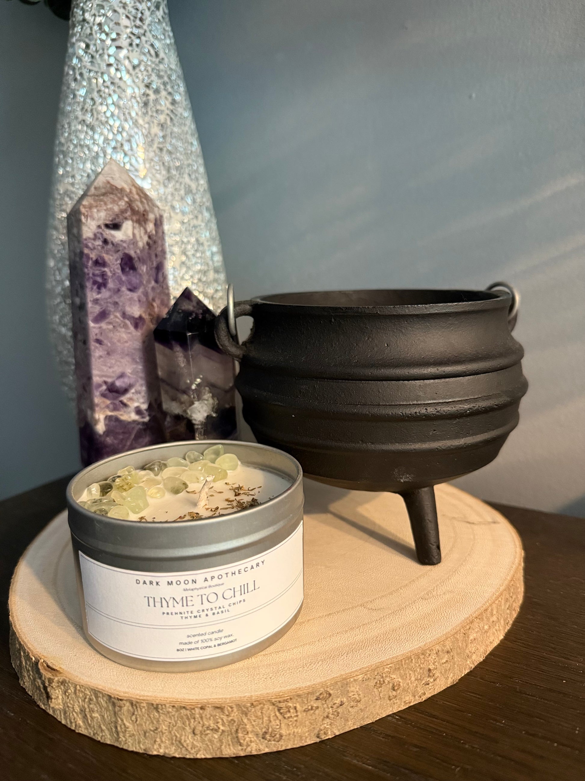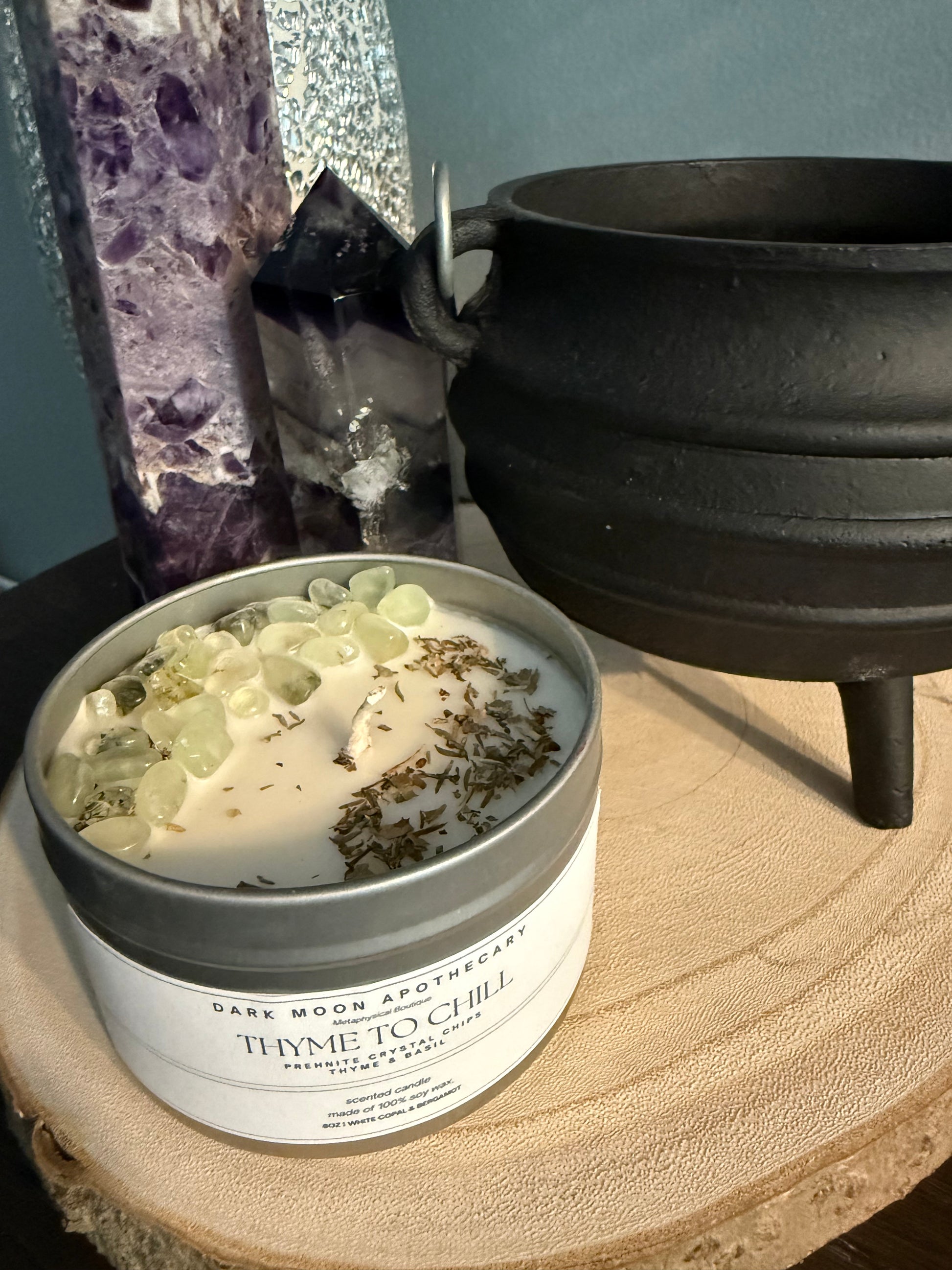 When life speeds up, let this candle slow you down. Thyme to Chill is your cue to exhale, crafted to bring ease, clarity, and a moment of pause. Topped with pale green prehnite crystals, this candle supports emotional healing, harmony, and restful clarity.