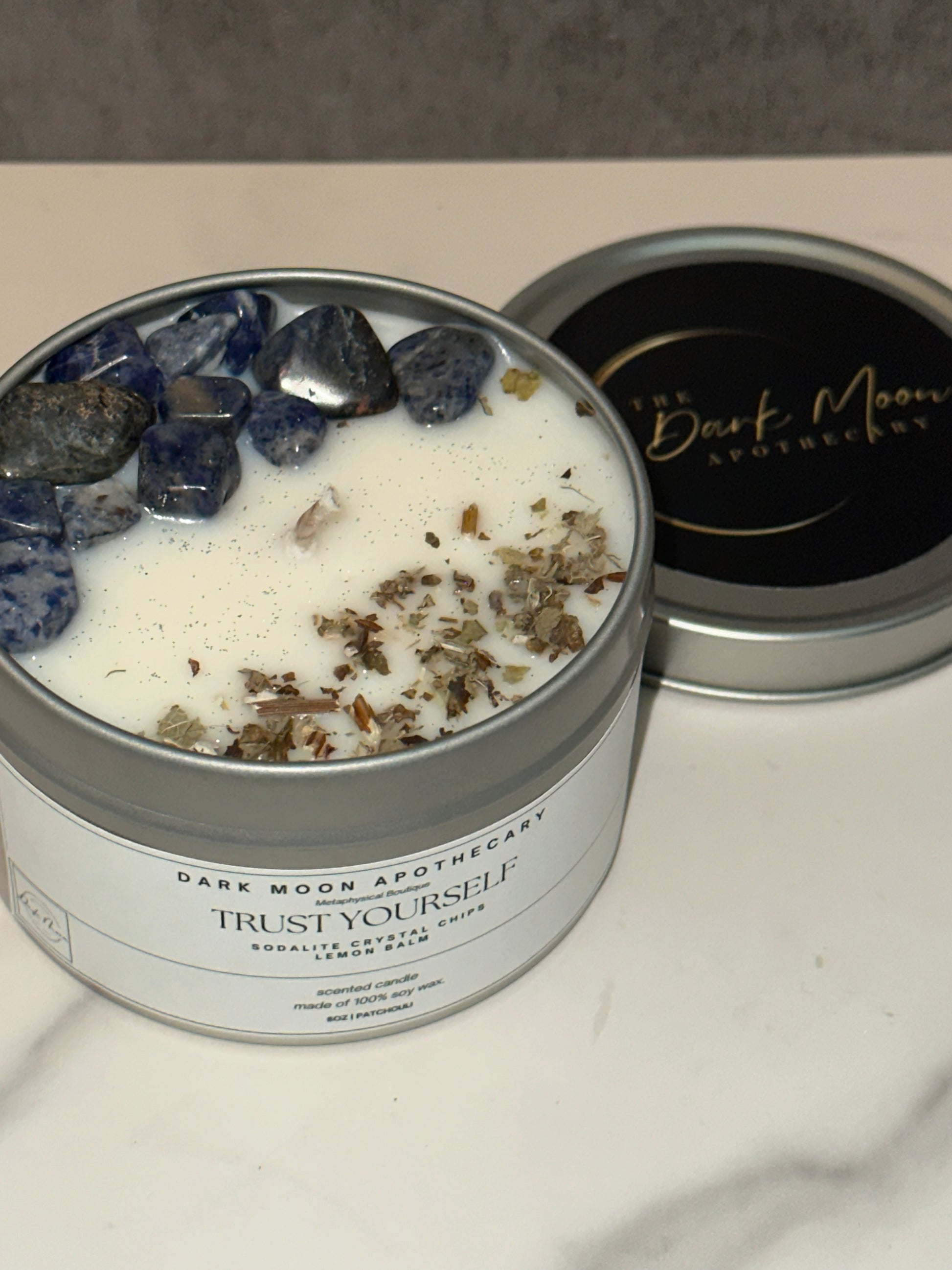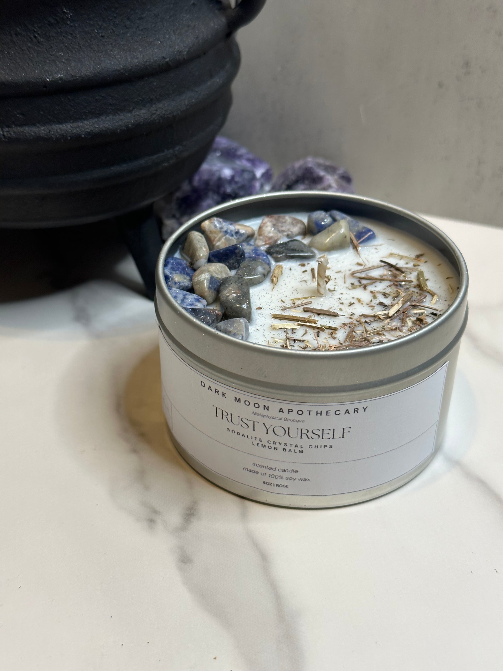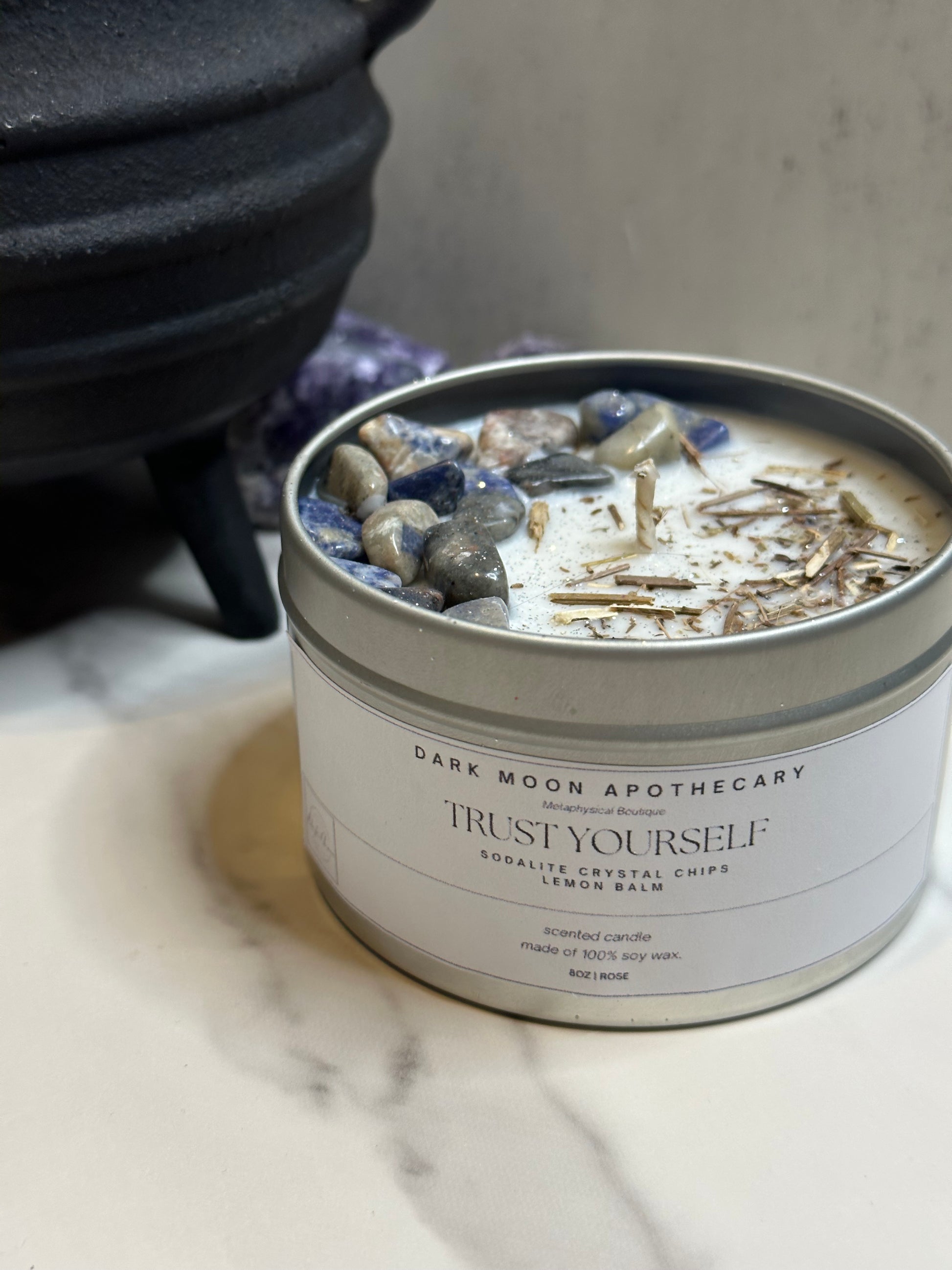 When doubt creeps in, Trust Yourself is your steady anchor. This candle is topped with grounding sodalite crystals, known to support clarity, inner truth, and confident communication. Calming lemon balm balances the energy, while the delicate rose fragrance adds a nurturing softness to your space.