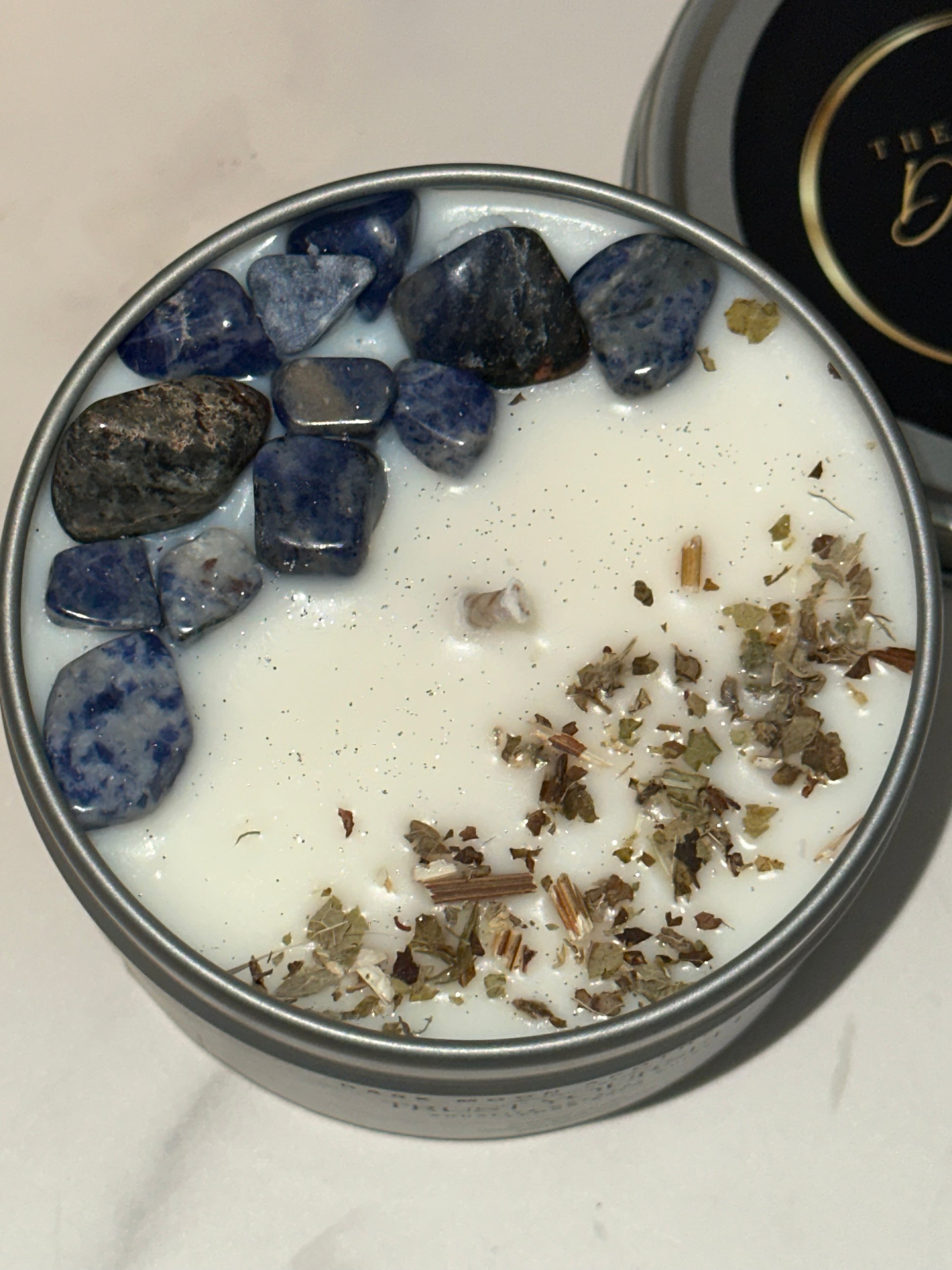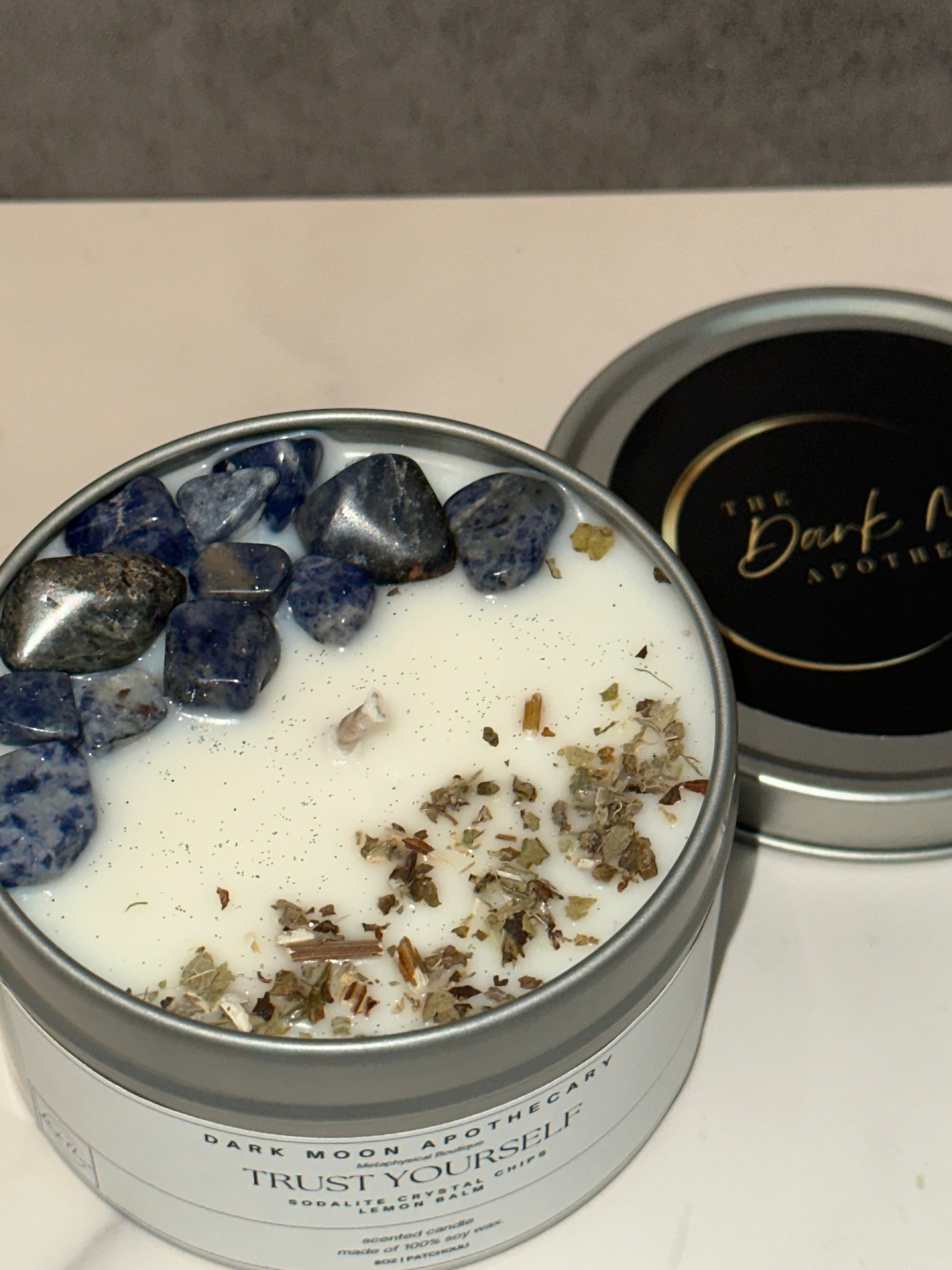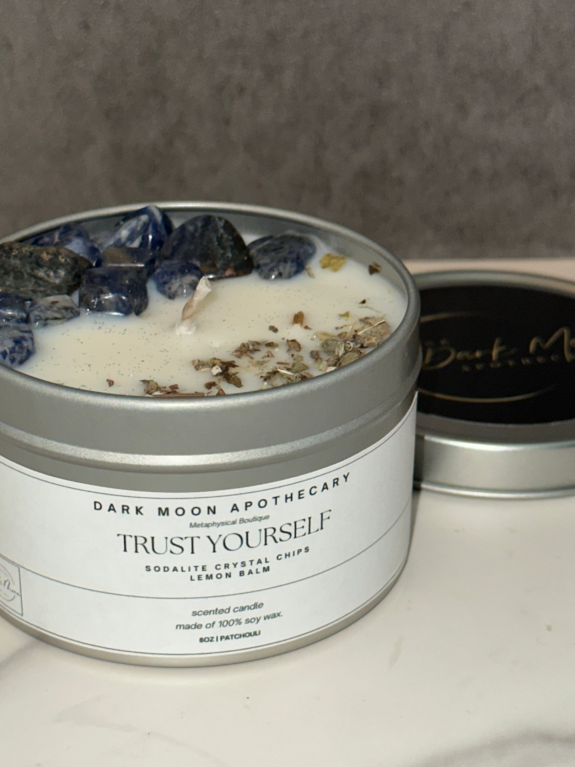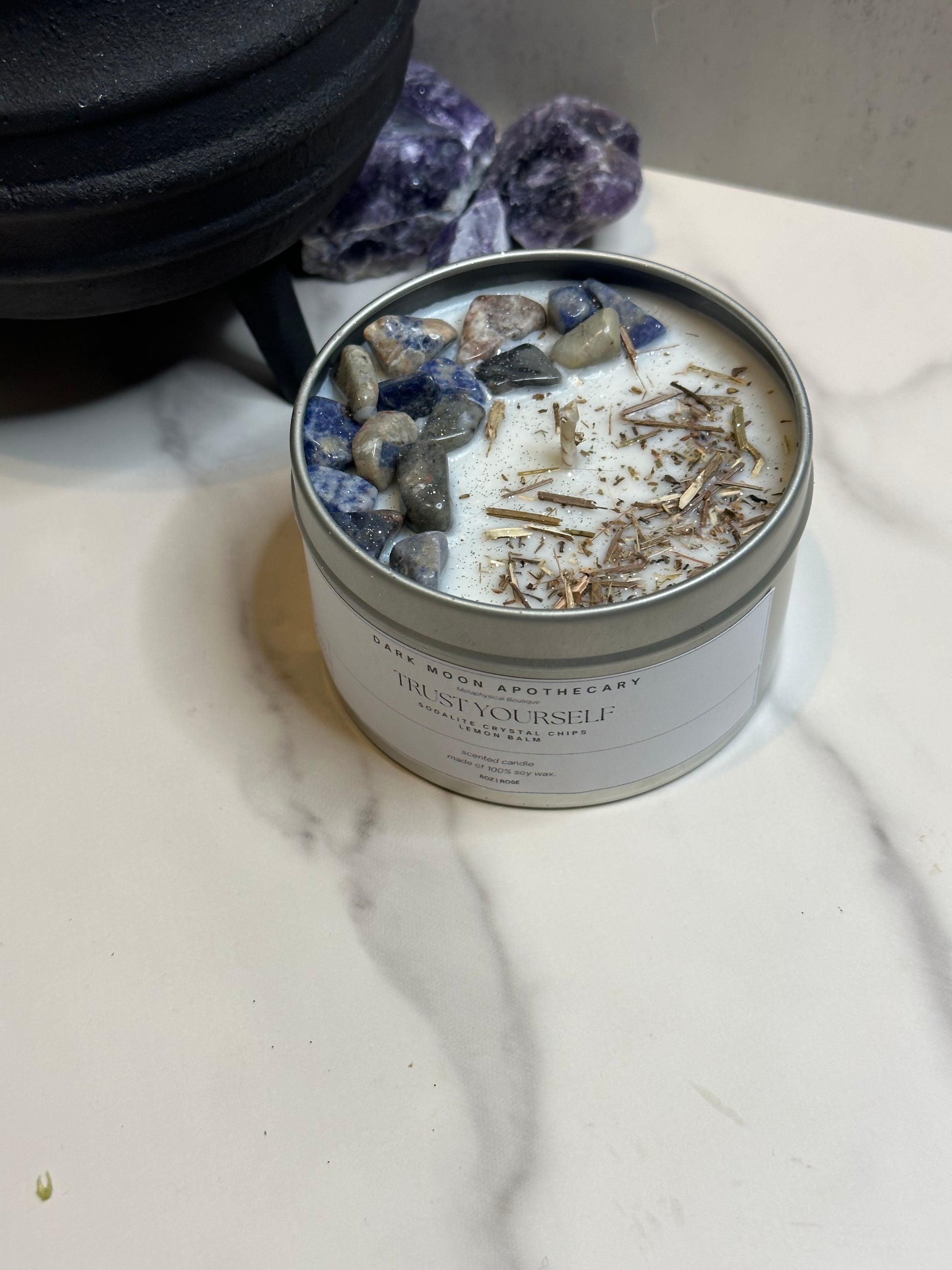 When doubt creeps in, Trust Yourself is your steady anchor. This candle is topped with grounding sodalite crystals, known to support clarity, inner truth, and confident communication. Calming lemon balm balances the energy, while the delicate rose fragrance adds a nurturing softness to your space.